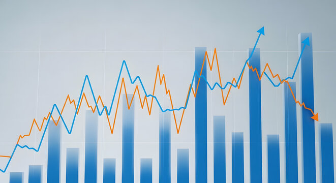 Transparent overlaid financial charts visualizing market data