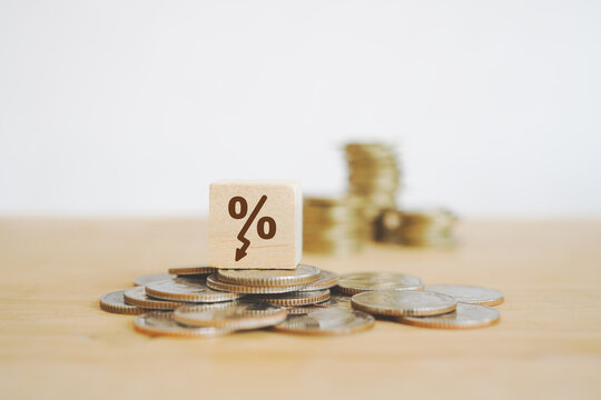decreasing percent sign on wooden cube block on pile of coins and blurred stack of coins