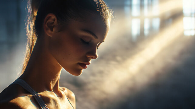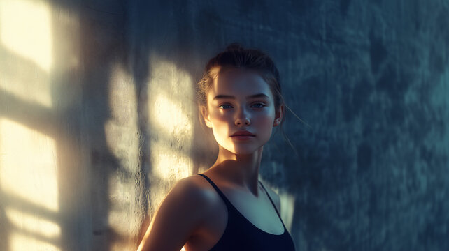 Portrait of a young ballerina. She looks concentrated, purposeful, focused. She is in a concrete studio. Rays of sunlight fall on her face.