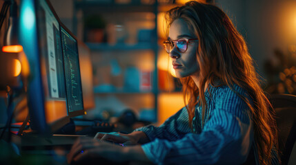 Focused software developer working late at night, coding on dual monitors in a modern home office setting.