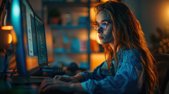 Dedicated Developer Coding In Nighttime Home Office Environment Images