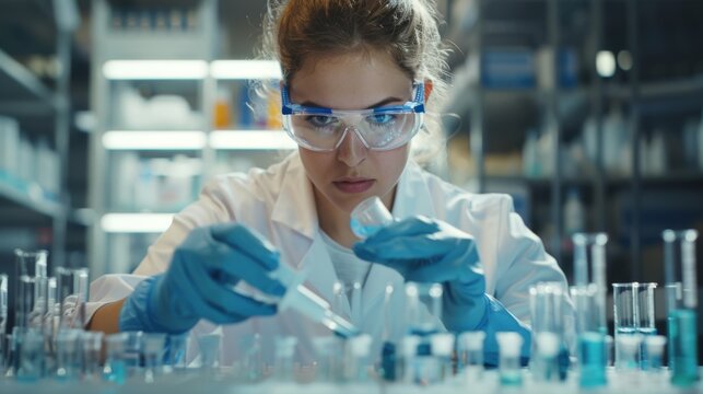 Young Female Scientist in a Laboratory Conducts Experiment with Precision, Wearing Safety Gear and Focused on Small Sample in Petri Dish at Research Facility