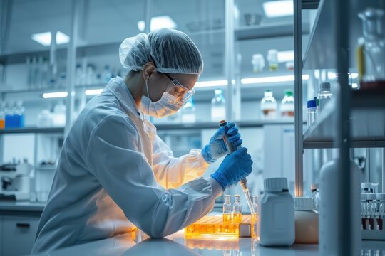 Dedicated Researcher in Modern Laboratory The cool blue tones and crisp lighting highlight the cutting edge nature