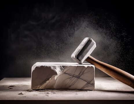 Sculpting Stone: A Craftsman's Tool and the Beauty of Raw Material, with Dust Frozen in Time. A Testament to Dedication.