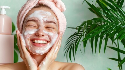 Happy woman cleansing face in bathroom with towel on head