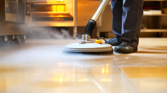 Person Using Steam Cleaner on Kitchen Floor for Deep Cleaning and Sanitizing in Modern Kitchen Environment