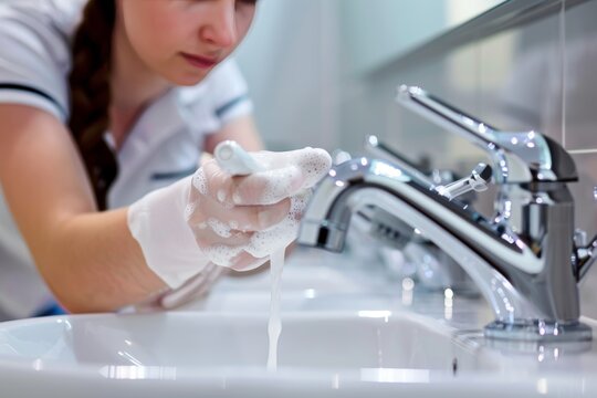 Woman cleaning bathroom faucet with sponge for hygiene maintenance and deep cleaning