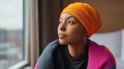 A young woman wearing an orange headscarf gazes out of a window, deep in thought and reflection