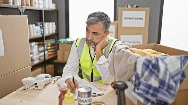 Hardworking young hispanic male volunteer, grey-haired and handsome, diligently writing checklist in community center, deep in conversation on telephone