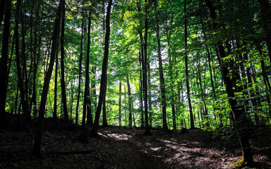 A narrow footpath in  a green deep and thick summer forest with maple tree in the foreground and shadows falling on the dirt road surface