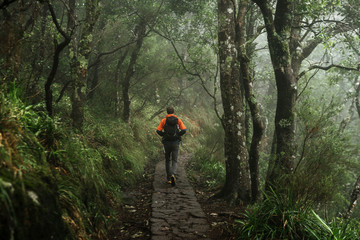 Adult male wandering on a path through the deep rain forest of Madeira, Portugal