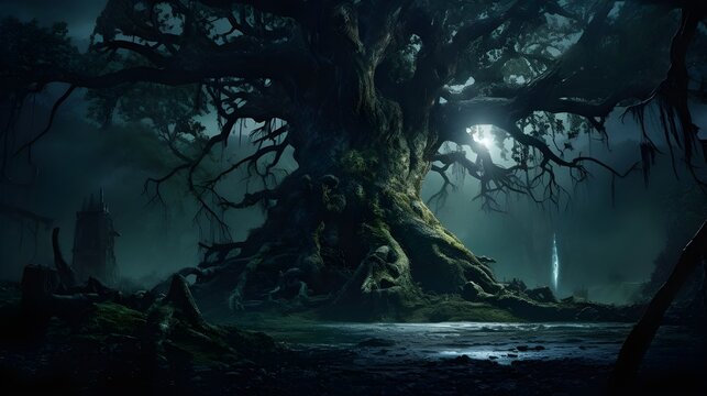 Majestic ancient tree trunk reaching skyward through vibrant green forest canopy on sunny day