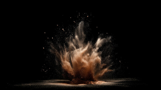 Dynamic brown powder suspended in mid-air against a deep black background, capturing movement.