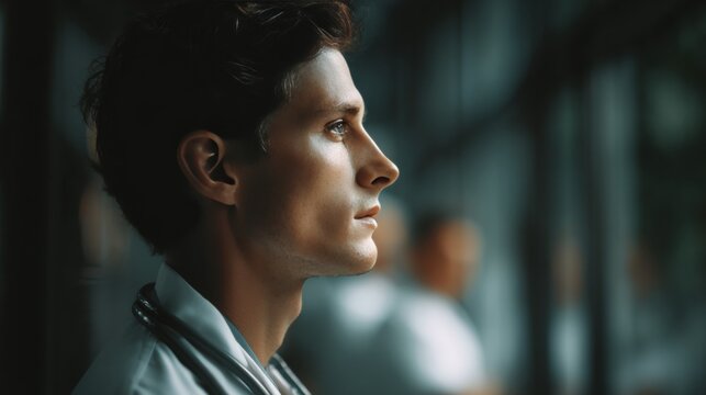 Male with intense gaze, lost in thought. Actor or model portraying a deep contemplative moment.