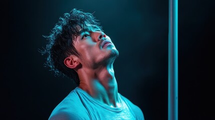 A reflective moment captured as a man gazes upward, illuminated by dramatic lighting, suggestive of deep thought or aspiration, creating an evocative portrait.