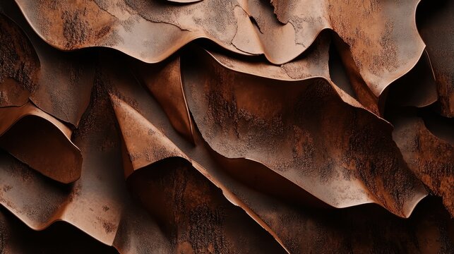 An abstract composition of textured, rusted metal sheets showcasing rich browns and deep shadows.