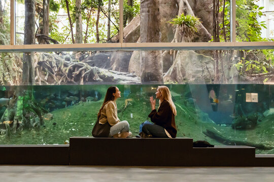 Two White female friends in their 20s sit cross-legged in front of a lush aquarium, deep in conversation as aquatic life swims behind them. The concept of connection with nature and mindfulness.
