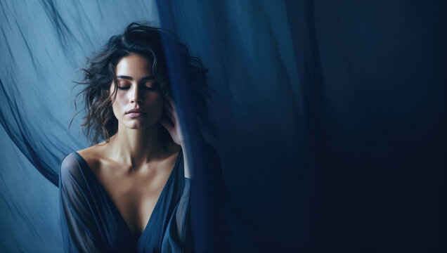 Middle-aged woman sitting on bed, deep in thought, hand on chin.