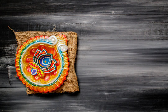Diwali glowing Diya and flowers arranged in circular shape forming a design with copy space, selective focus