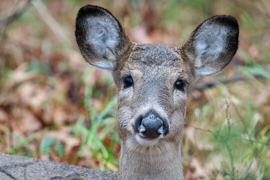 Close up headshot portrait of a Whitetail Deer buck with a natural background