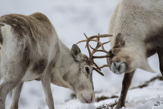 reindeer, Rangifer tarandus, grazing, foraging in the snow on a windy cold winters day on a hill in the cairngorms national park, scotland.
