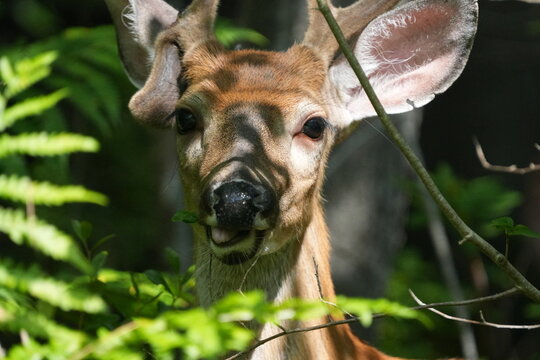 Ultra-close up of the face of a White-tailed Deer looking into the camera