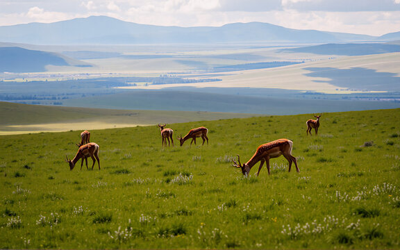 A herd of deer peacefully grazes in a vast green field with rolling mountains far off in the background under a bright cloudy sky.