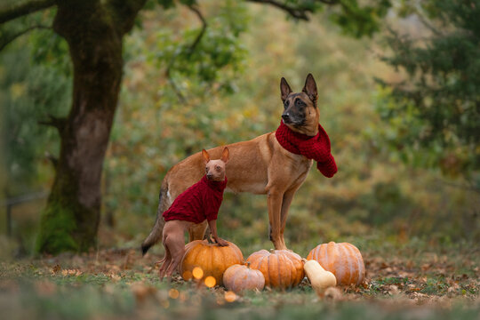 A group of beautiful dogs wearing scarves and sweaters is walking through an autumn forest with pumpkins
