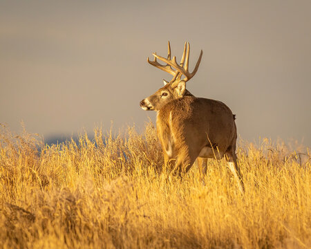 Mature male Whited tailed deer stands at edge of marsh surveying before walking further out into field during sunset at Rocky Mountain Arsenal National Wildlife Refuge