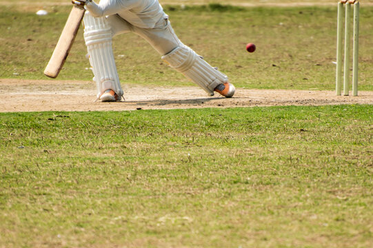 Batsman playing defensive stroke during cricket match