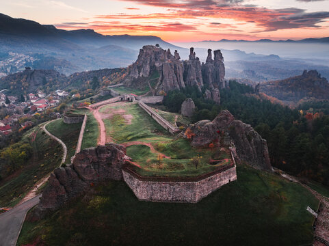 Medieval stone fortress on forested hillside at sunset