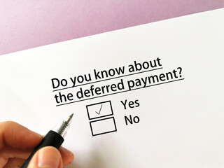 Deferred. Lawyer holding a card in his hand. Text on the board presents term. Blue background. Law, justice, judgement