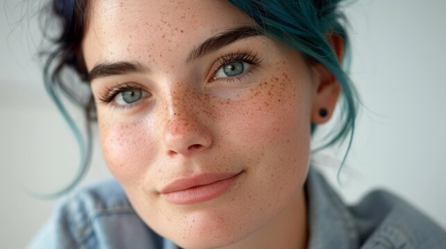 A closeup of a woman's face with azure hair and freckles. Her nose is petite, cheeks rosy, lips full, eyebrows arched, eyelashes long, smiling mouth, defined jawline, and a slender neck