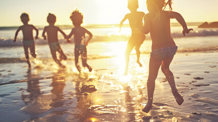 kids running at the beach defocused image  Focus on sand Instagram effect : Generative AI