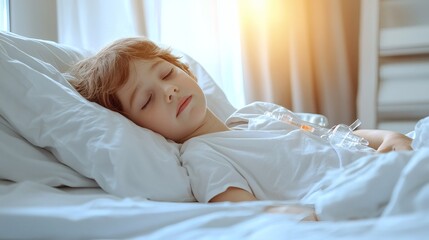 A weak and dehydrated child lying on a hospital bed, with a transparent IV drip, symbolizing treatment for waterborne diseases, copy space on the left.