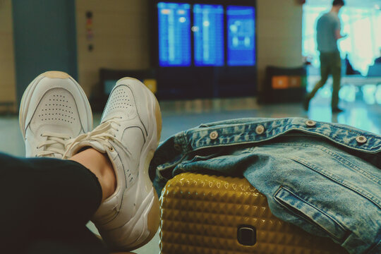 woman passenger, traveler in the transit area of the air port terminal waiting for the next flying schedule, missing, delay cancel of the flight