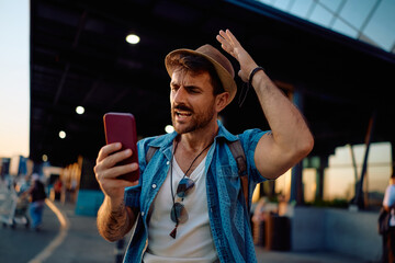 Frustrated traveler reading text message on mobile phone at the airport.
