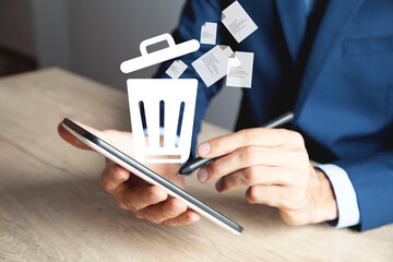 Image of a manl with tablet in his hands. He presses trash can icon. The concept of deleting files, contacts, putting in order, cleaning service etc