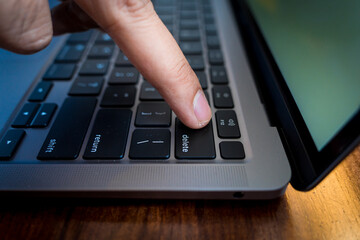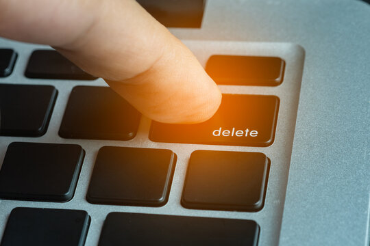 Close up of finger pressing on delete button on the laptop computer. Delete everything