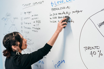 Woman erasing whiteboard in office
