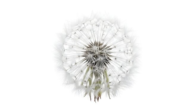 A high-key macro photograph features a centered white dandelion seed head, with delicate seeds radiating outward. The thin light green stem is visible below the seed head, all set against a pure white