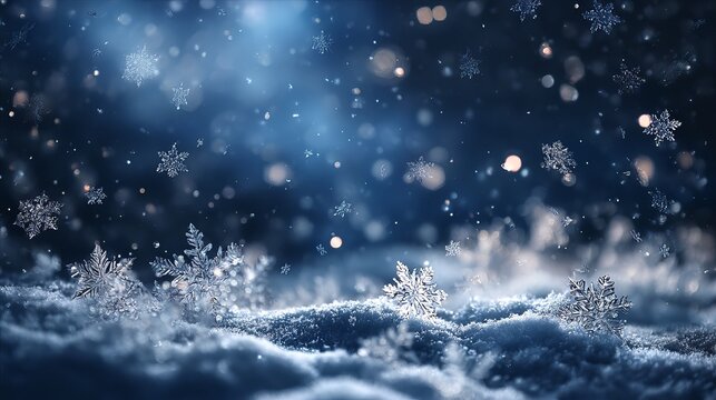 Enchanting winter wonderland showcasing delicate snowflakes falling gently onto soft snow under magical blue light