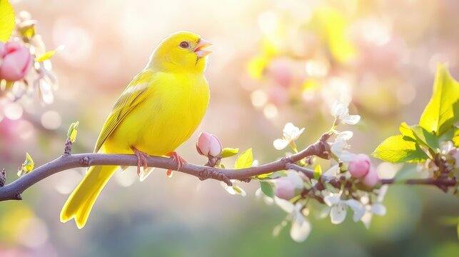 Vibrant yellow bird perched on a blossoming tree branch illuminated by soft sunlight creating a colorful spring scene with delicate textures