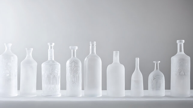 A row of frosted glass bottles, each a unique shape and size, bathed in soft, diffused light. The subtle textures and delicate forms evoke a sense of tranquility and artistry.