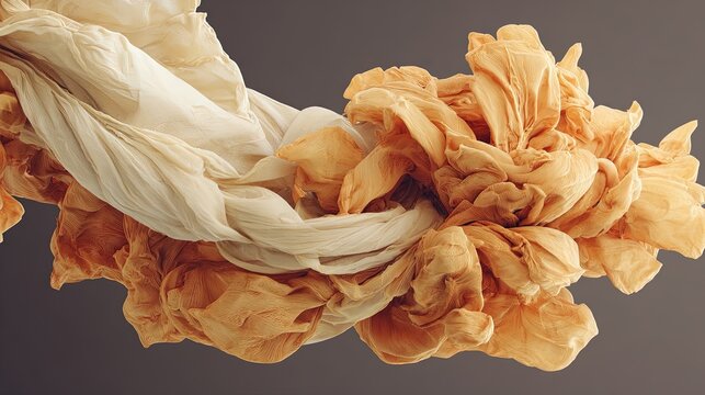 Flowing beige and warm orange fabric folds with delicate textures against a solid dark background Intricate abstract material with