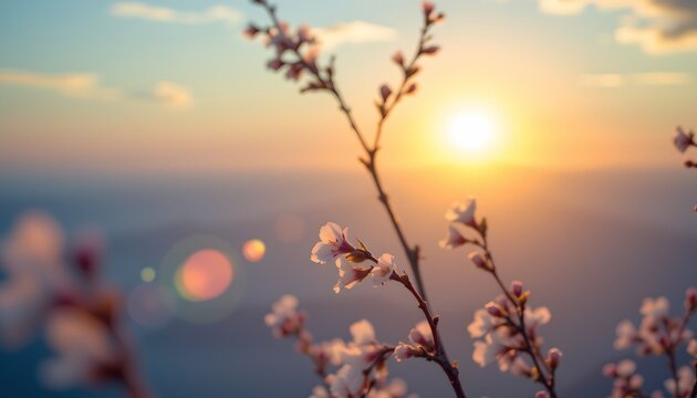 A serene landscape featuring a blooming plant with delicate pink flowers nestled among branches at sunrise or sunset. The sky is a gradient of warm colors, providing a tranquil backdrop to the scene.