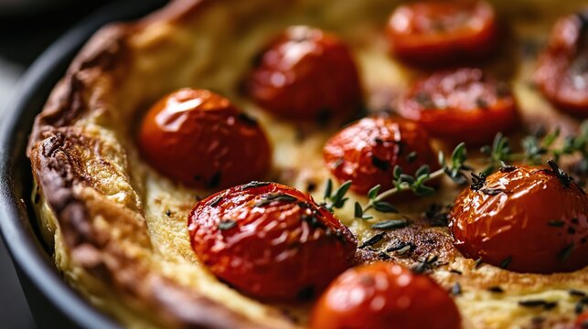 Omelette with red tomatoes and rosemary on a frying pan
