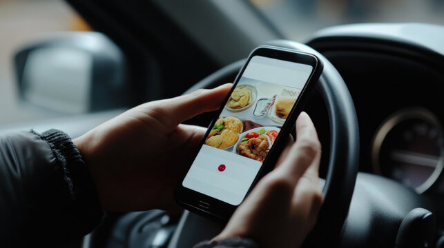 Smartphone in Hand Showing Food Delivery App While Driving Car