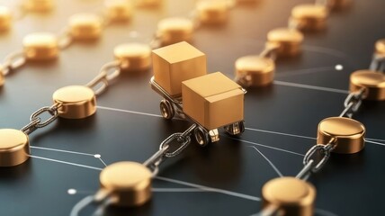 E-commerce growth forecast 2025 concepts. Two cardboard boxes connected by a chain on a digital grid background.