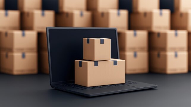 A laptop displays cardboard boxes, symbolizing e-commerce and online shopping, with many more boxes in the background.